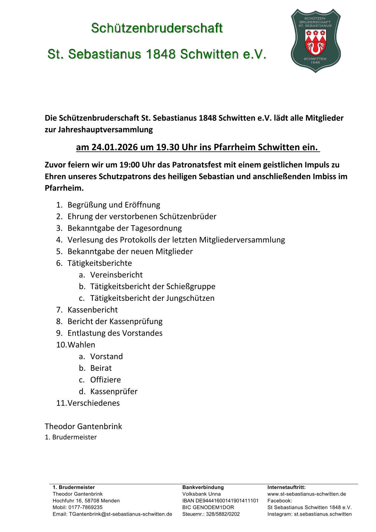 Vor der Versammlung feiern wir um 19:00 Uhr das Patronatsfest zu Ehren des Schutzpatrons, des heiligen Sebastian. Anschließend wird zu einem gemütlichen Imbiss ins Pfarrheim eingeladen.