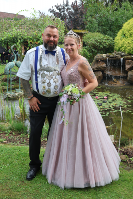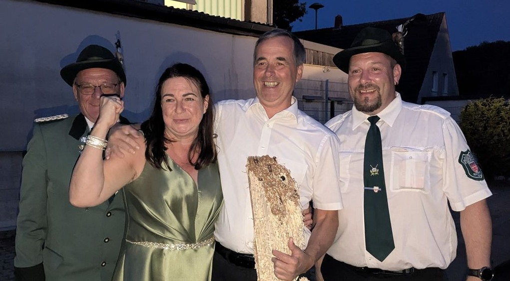 Parallel fand das Vogelwerfen der Kinder statt. Antonia Griese zeigte sich ein bisschen traurig, als sie ihrem Nachfolger Damian Krämer die Insignien überreichte. Dieser hatte versprochen, dass er bald auch eine Kinderkönigin habe. Am frühen Nachmittag hieß es dann: Antreten zum Vogelschießen. Der Andrang war groß. Schon mit dem 28. Schuss holte sich Yannick Rohe die Krone und wurde wieder Vizekönig. Mit dem 35. Schuss schoss Maximilian Halfmann den Apfel und mit dem 44. Schuss Christopher Holle das Zepter. Den rechten Flügel schoss Marco Oehmer mit dem 135. Schuss, dicht gefolgt von Markus Habring, der mit dem 142. Schuss den linken Flügel schoss. Nun dauerte es. Ute und Herbert Pantel lieferten sich einen spannenden und amüsanten Kampf um die Königswürde. Letztendlich war Herbert treffsicherer und erlegte um 22:34 Uhr den Vogel mit dem 306. Schuss. Natürlich nahm er seine Frau Ute zur Königin. Sie regieren nun die Schwittener Schützen.